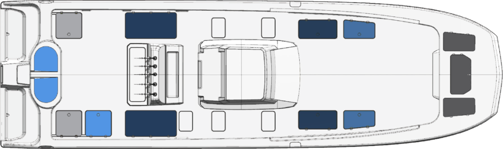 A proven sport fishing machine, the 40' Catamaran is fast and efficient thanks to a patented semi-asymmetrical and ventilated hull designed by Morrelli and Melvin Naval Design and Engineering. Built for quad outboard propulsion up to 1,800 horsepower, this versatile offshore platform was created with the help of Computational Fluid Dynamics simulations. The result is a lightweight boat that runs hard, turns fast, and is incredibly stable.