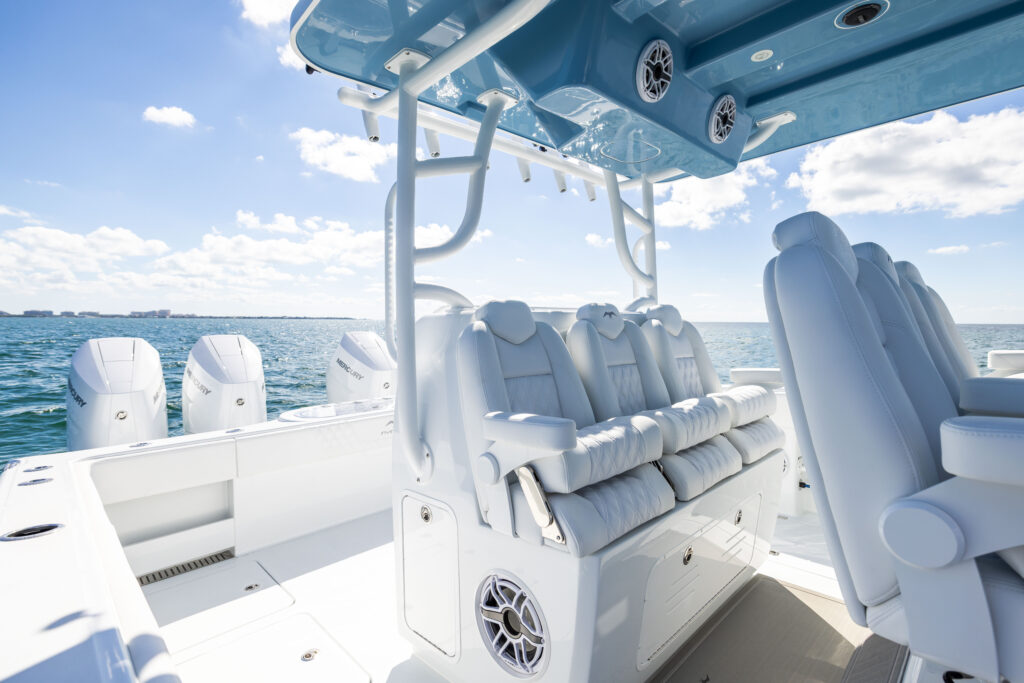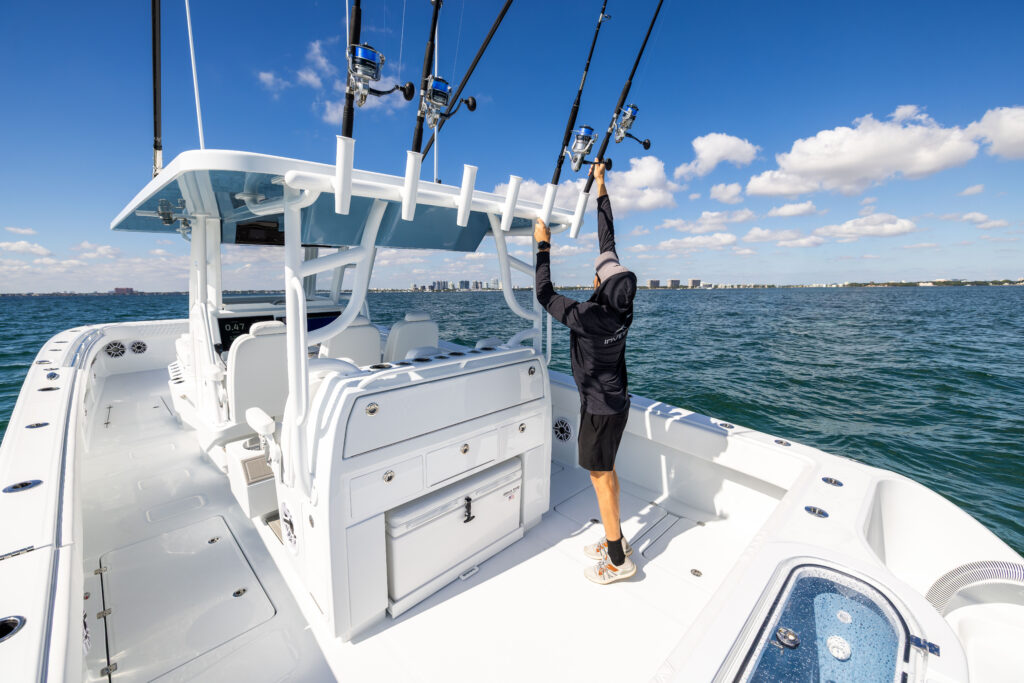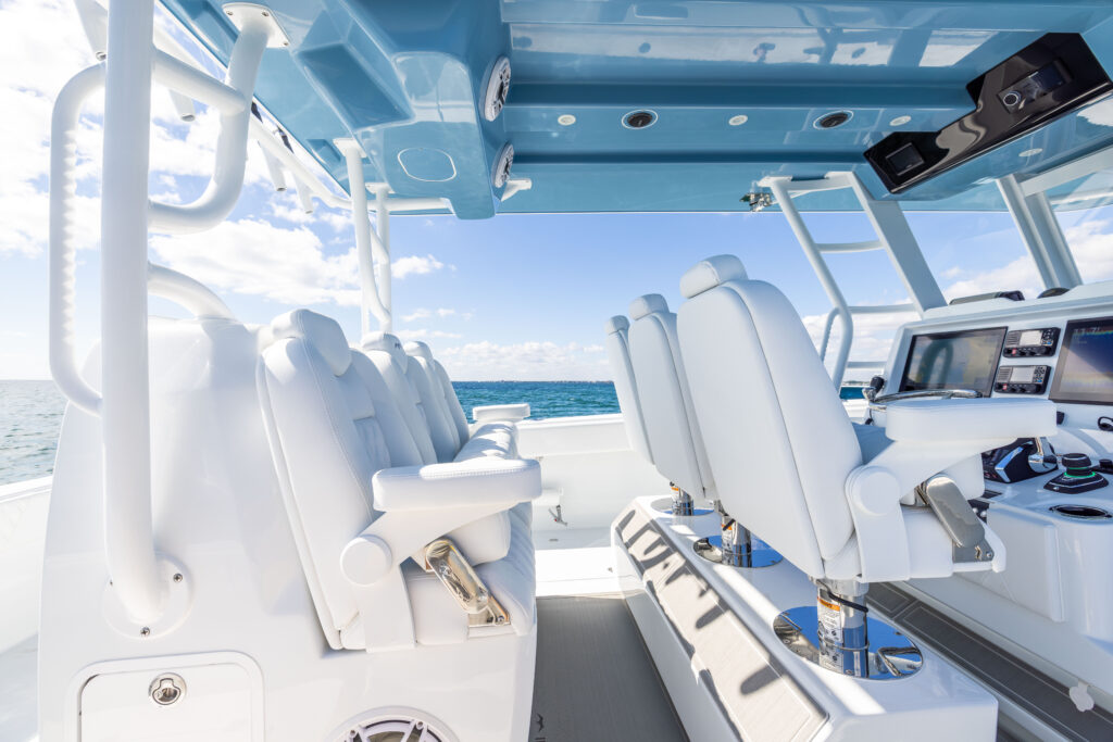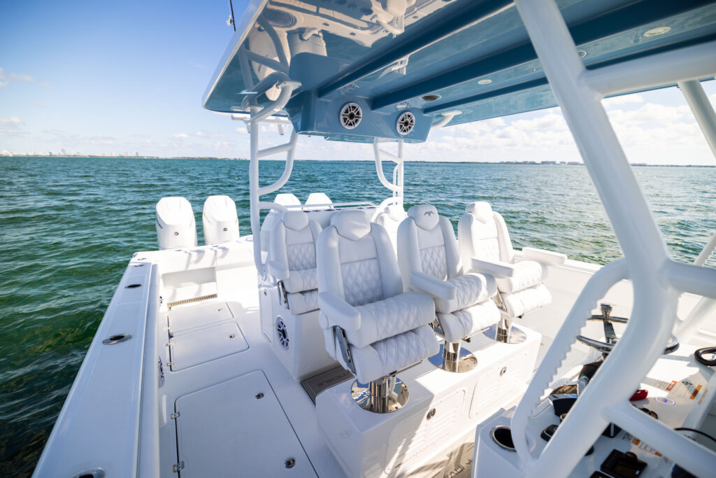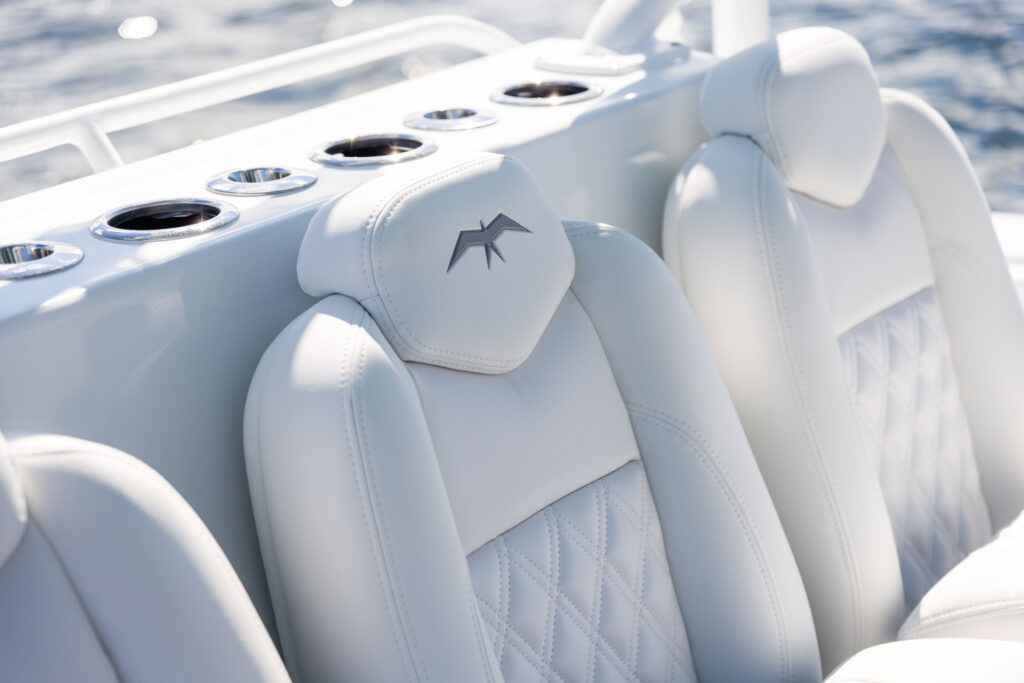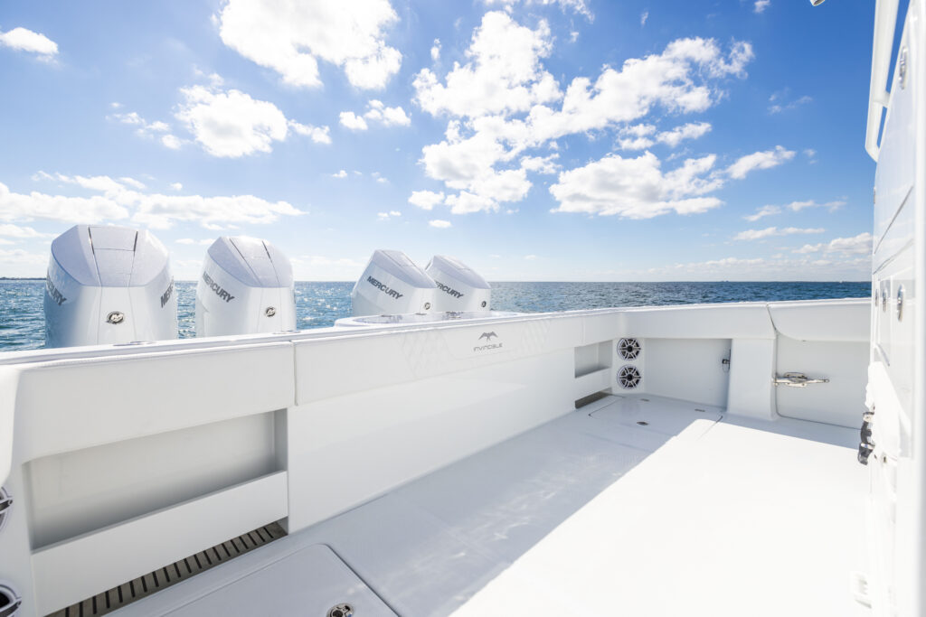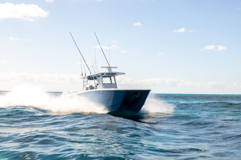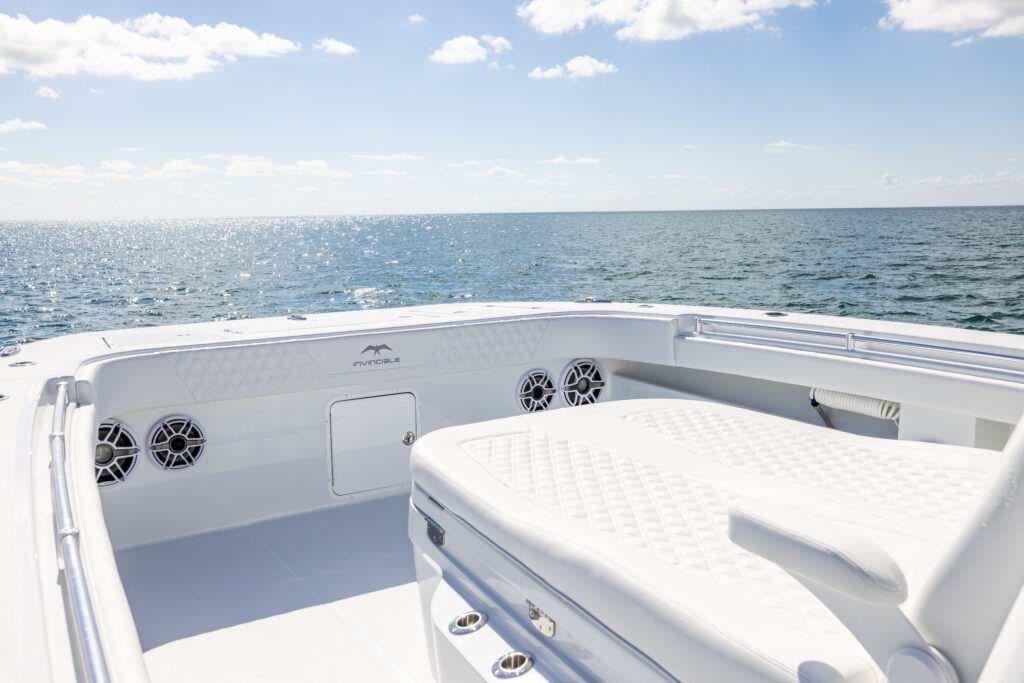 The new 38’ Catamaran packages all the amenities and equipment of a much larger boat into an efficient and powerful package. Now available with dual-row helm seating, the platform gives you the size and room you need, with the easy handling and incredible performance you expect from an Invincible. Renowned naval architects Gino Morrelli and Pete Melvin designed this semi-asymmetrical 38' catamaran hull, setting the industry standard of cat performance. No pursuit is off limits.