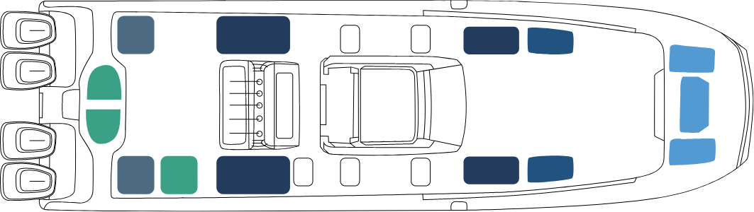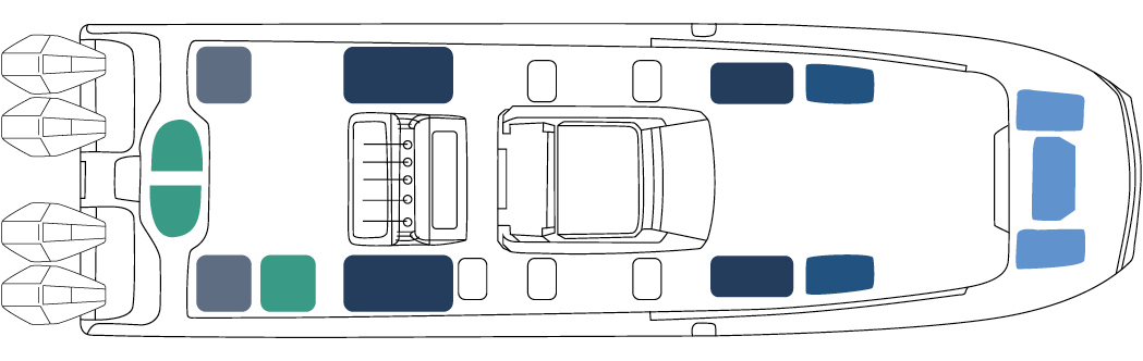 A proven sport fishing machine, the 40' Catamaran is fast and efficient thanks to a patented semi-asymmetrical and ventilated hull designed by Morrelli and Melvin Naval Design and Engineering. Built for quad outboard propulsion up to 1,800 horsepower, this versatile offshore platform was created with the help of Computational Fluid Dynamics simulations. The result is a lightweight boat that runs hard, turns fast, and is incredibly stable.
